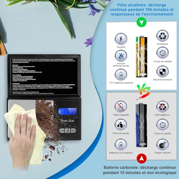 La balance peut être convertie en 6 unités (g, oz, gn, ct, ozt, dwt)Un capteur de haute précision permet une valeur de graduation de 0,01 g.