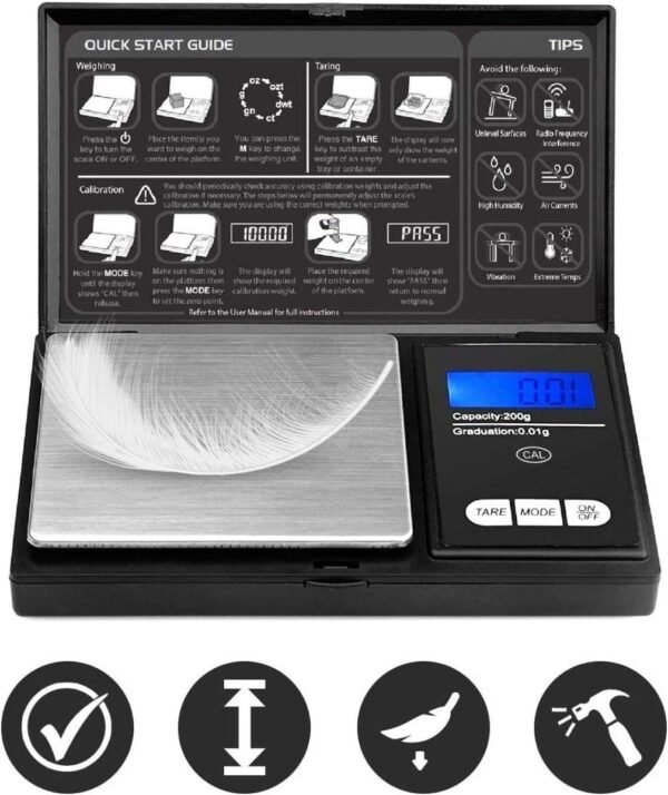 Avec une plage de pesée maximale de 500g La balance présente une surface en acier inoxydable de tréfilage métallique, une base en plastique ABS et un écran d’affichage numérique LCD HD.