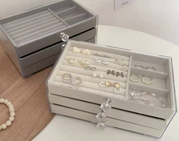 Cette boîte à bijoux en acrylique protège vos bijoux de la poussière et de l’eau.