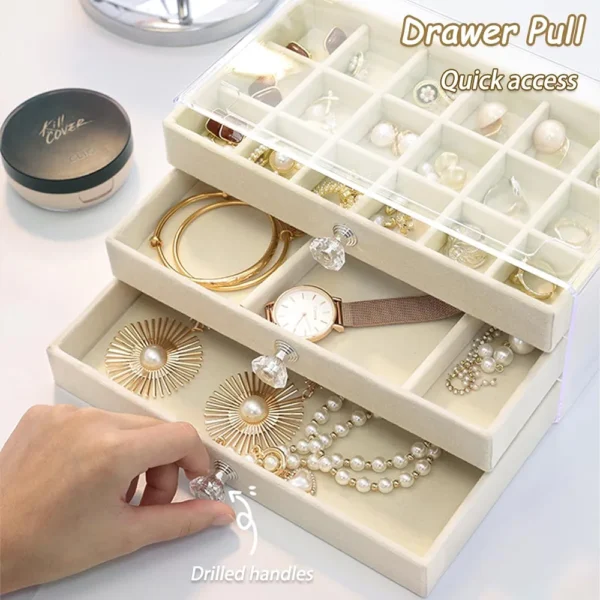 La boîte à bijoux est livrée avec 3 tiroirs et compartiments de rangement amovibles offrant une grande capacité. Vous pouvez ajuster la taille et le nombre de partitions en supprimant ou en ajoutant des séparateurs pour allouer l’espace dont vous avez besoin.