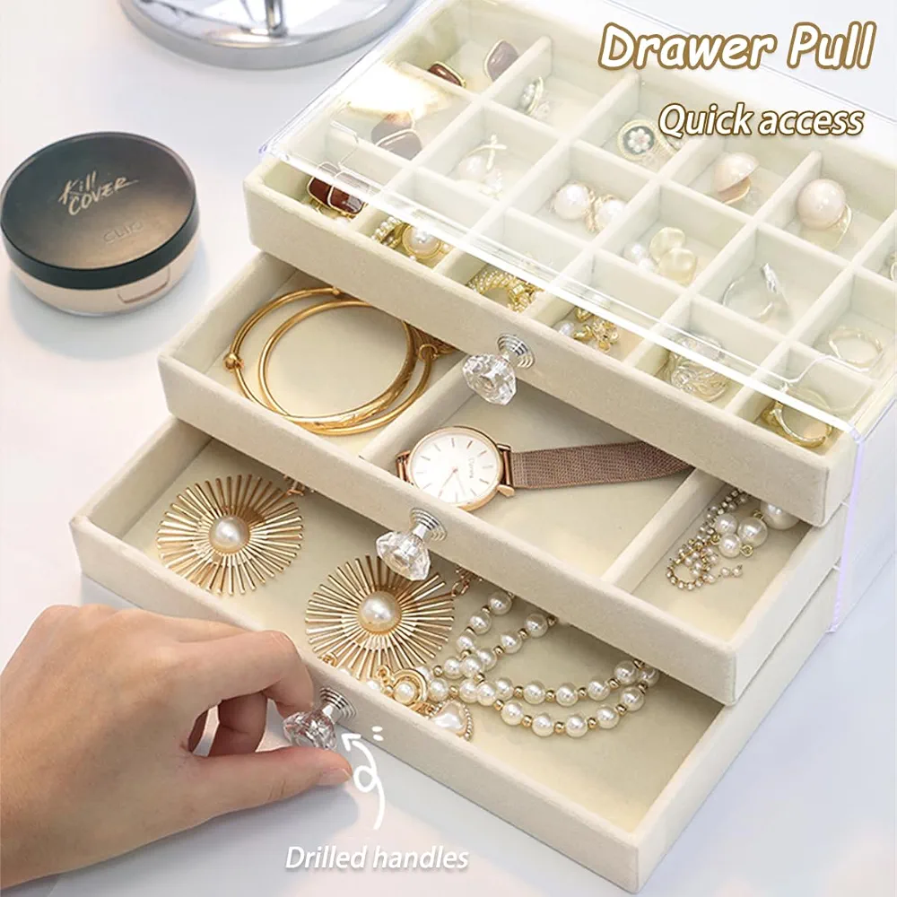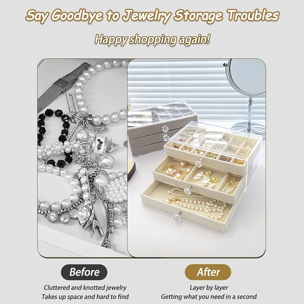 La boîte à bijoux est livrée avec 3 tiroirs et compartiments de rangement amovibles offrant une grande capacité. Vous pouvez ajuster la taille et le nombre de partitions en supprimant ou en ajoutant des séparateurs pour allouer l’espace dont vous avez besoin.
