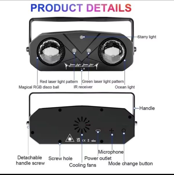 Ce modèle 5-en-1 amélioré combine éclairage de fond, laser et LED pour une expérience festive unique. Il offre 120 combinaisons d’images, des fonds LED multicolores et 2 combinaisons de faisceaux (vert et rouge), pour une ambiance scénique exceptionnelle grâce à des effets multiples et une projection haute définition.