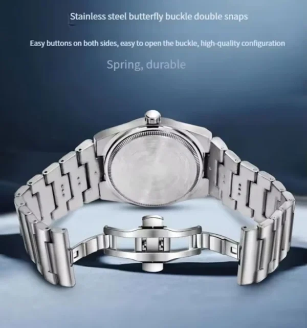 Le bracelet est doté d’une boucle déployante de sécurité et d’un affichage de la date.