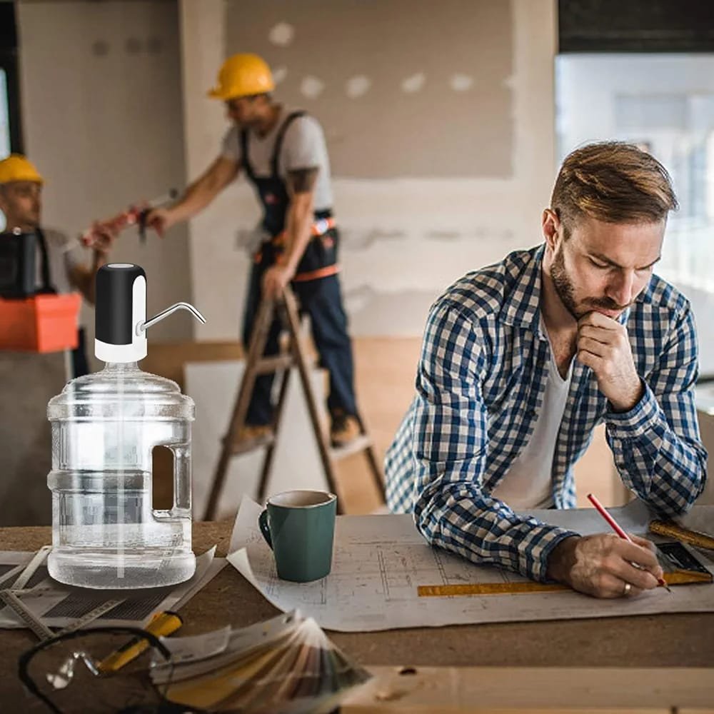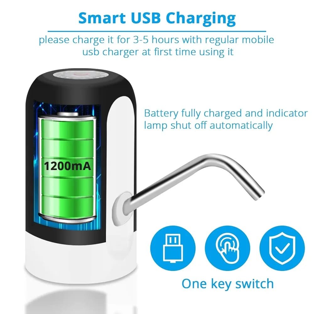 Matériau sûr : distributeur d’eau portable sans BPA, tuyau en silicone de qualité alimentaire, acier inoxydable 304, plastique ABS haute densité, non toxique et sans odeur, chargement USB, pompe à bouteille d’eau avec batterie au lithium intégrée de 1200 mAh.