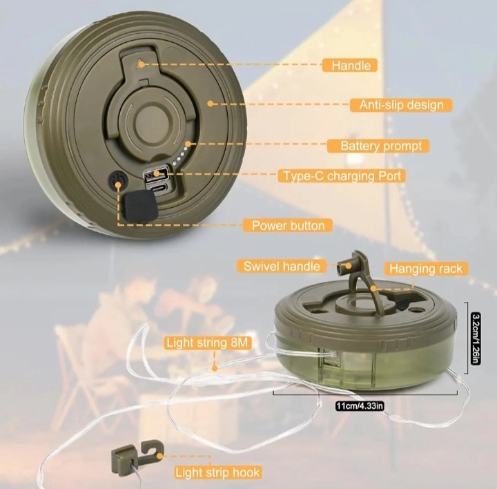 La lampe de camp et les lumières de la tente de camping peuvent être allumées en même temps ; Les lumières de camp peuvent également être utilisées séparément pour les réunions de famille, les pique-niques, le camping et d’autres occasions.