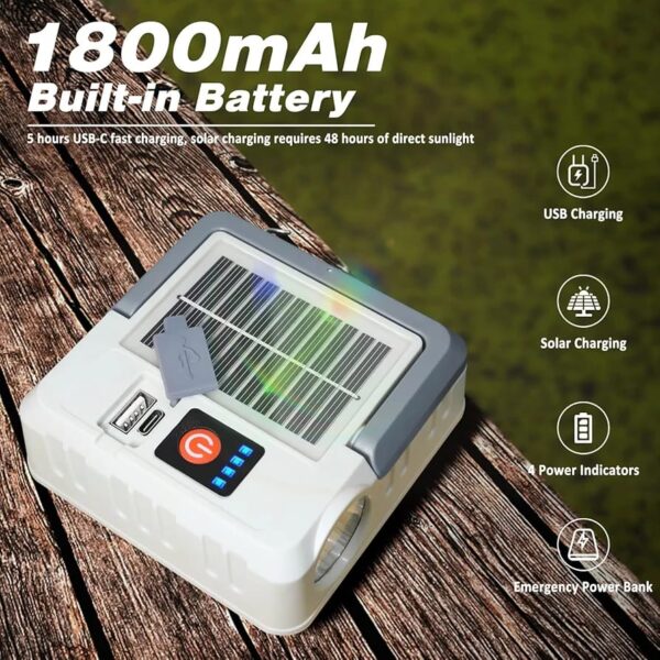 Avec batterie intégrée de 1 800 mAh, 4 heures de charge rapide via USB-C (câble inclus), la charge solaire nécessite 48 heures d’exposition au soleil, s’allume pendant 4 à 15 heures lorsqu’elle est complètement chargée.