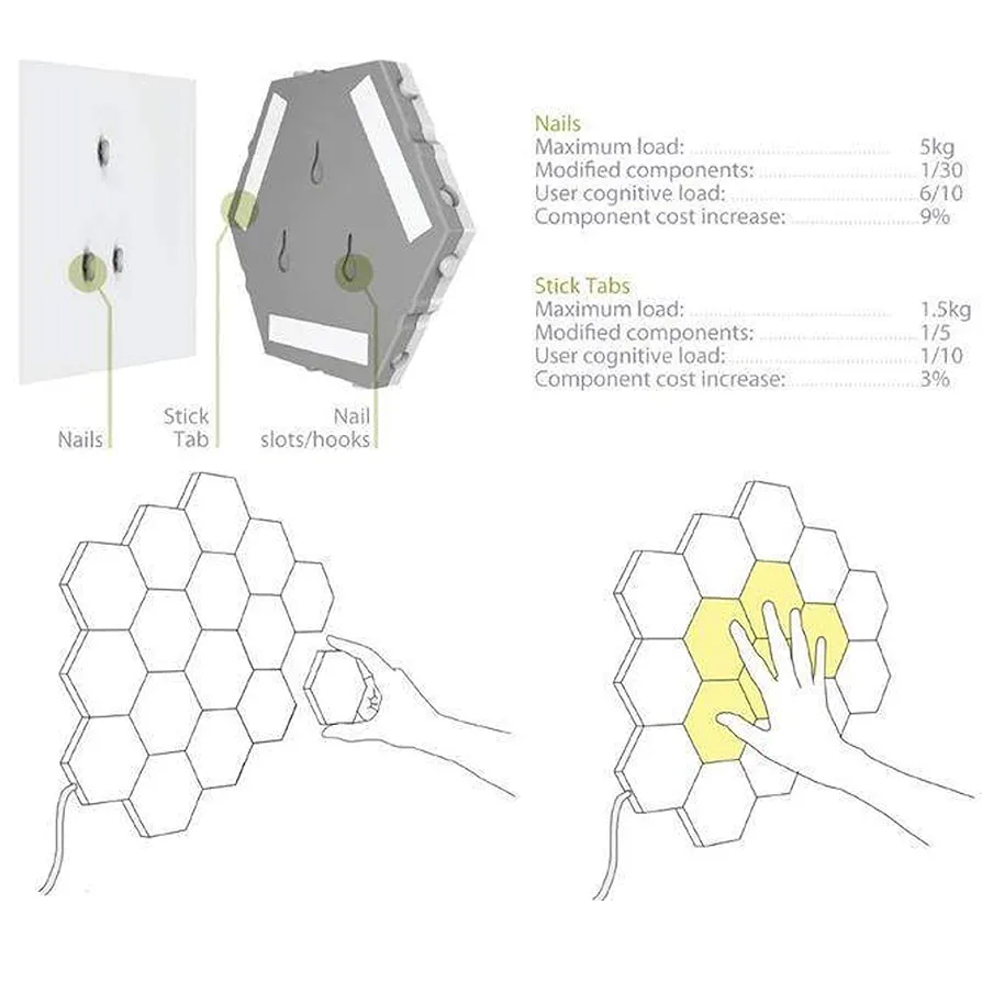 6 magnifiques lumières en forme d’hexagone, vous pouvez les placer comme vous le souhaitez pour former vous-même le design que vous souhaitez
