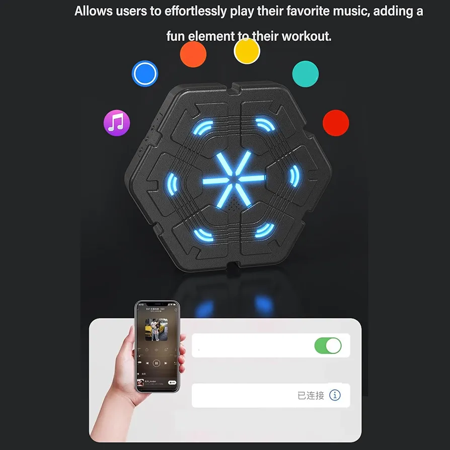 Faites passer votre expérience de boxe au niveau supérieur avec des effets d’éclairage LED dynamiques. Connectez-vous facilement à votre smartphone via Bluetooth et profitez de vos morceaux préférés tout en étant immergé dans le rythme et la mélodie. Cette combinaison parfaite d’excitation audio et visuelle améliorera vos entraînements.