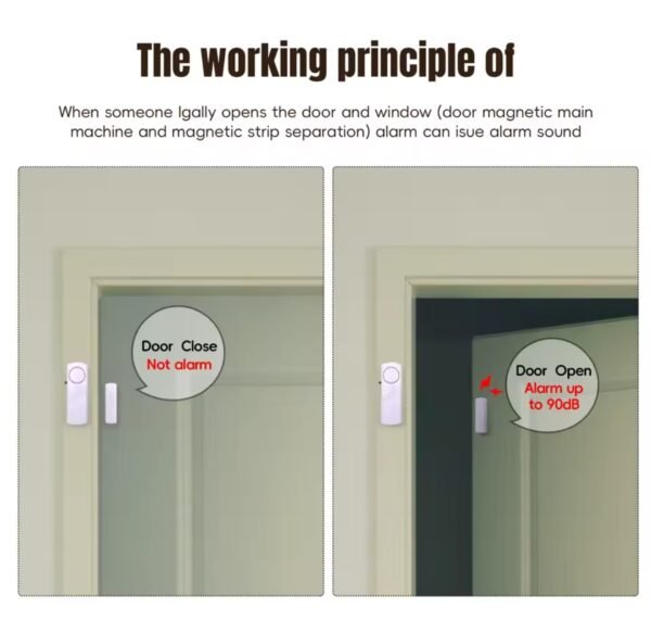 Passez en mode « ON » de l’unité principale pour être en état d’alarme, elle donnera une alarme de 90 bps si le capteur magnétique est déconnecté de l’alarme lorsque quelqu’un ouvre la porte/fenêtre.