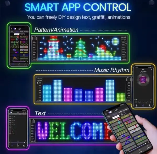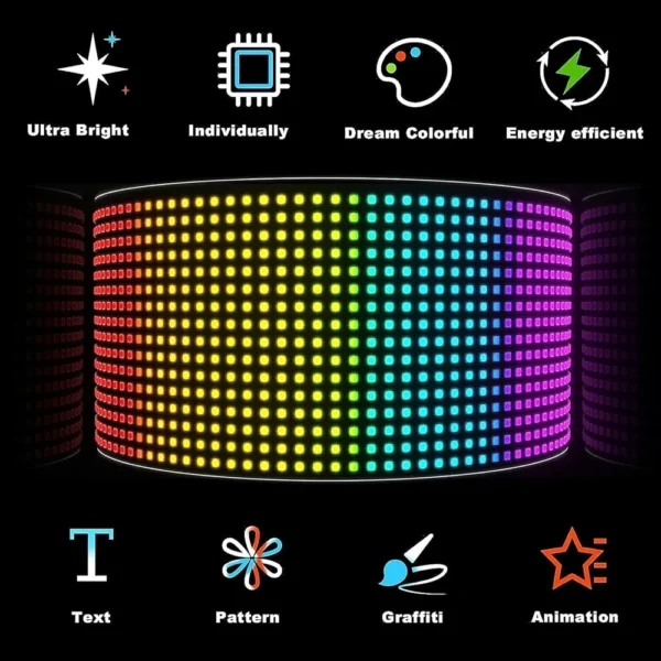 Grâce à ce panneau flexible, créez des textes, des motifs et des animations adaptés à vos besoins et à vos scènes, en ajustant la luminosité et la vitesse selon vos envies.