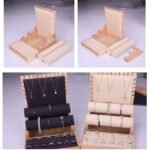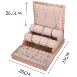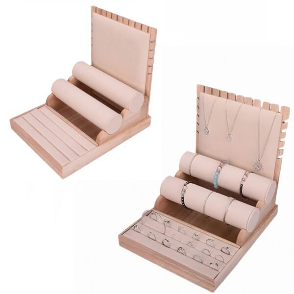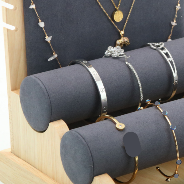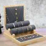 Le revêtement en suédine de la base en bois offre une texture douce qui met magnifiquement en valeur l’éclat des bijoux.