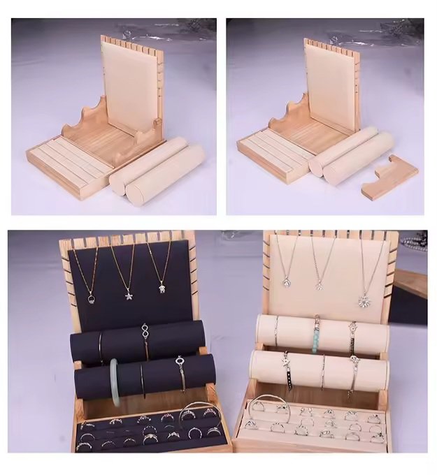 Le revêtement en suédine de la base en bois offre une texture douce qui met magnifiquement en valeur l’éclat des bijoux.