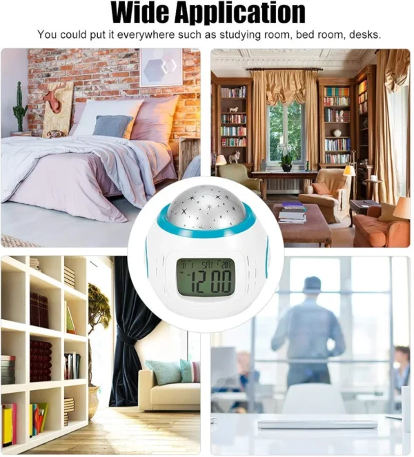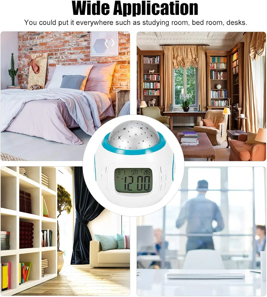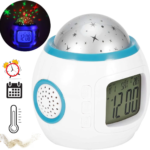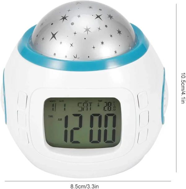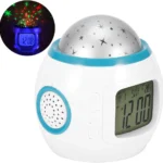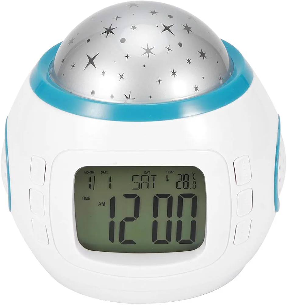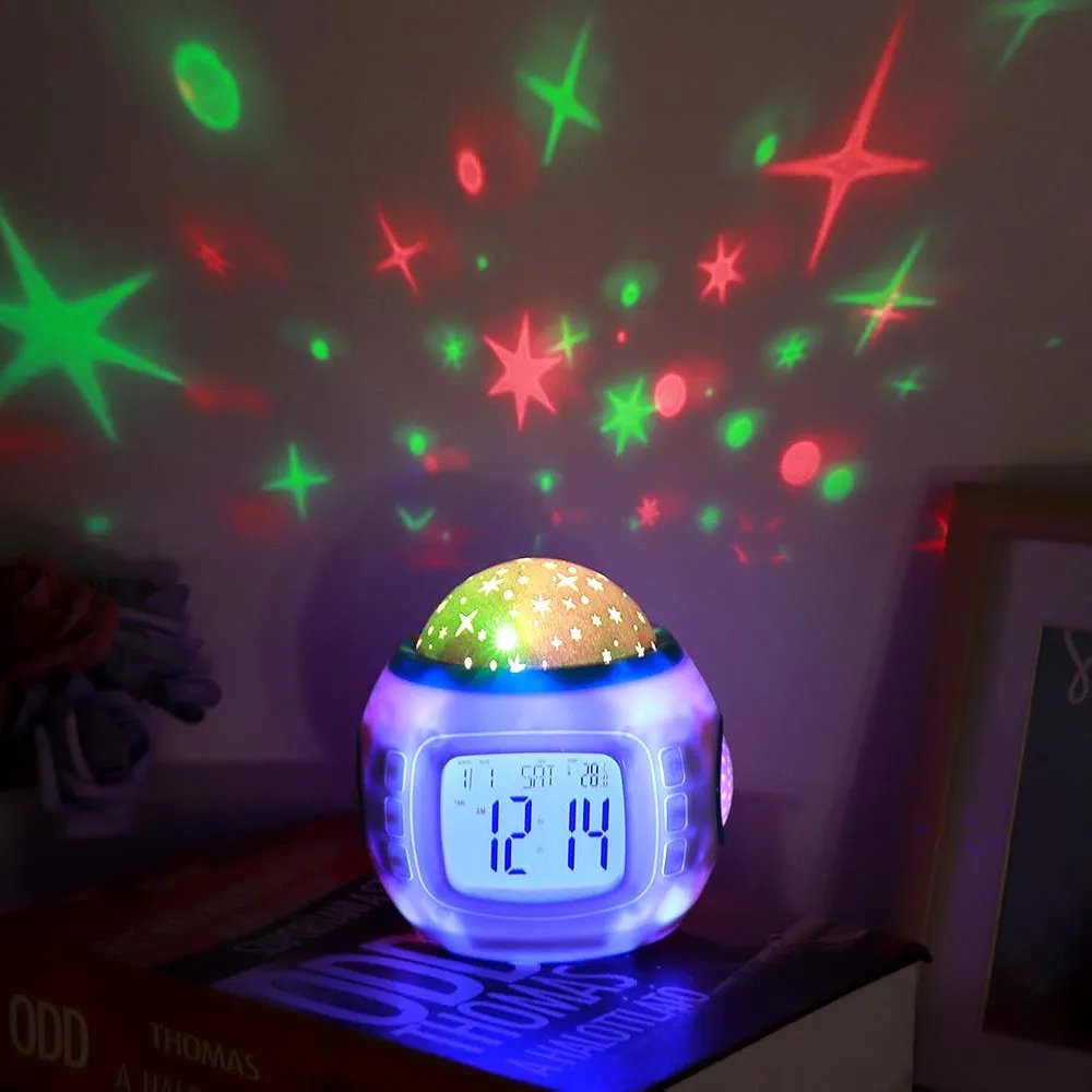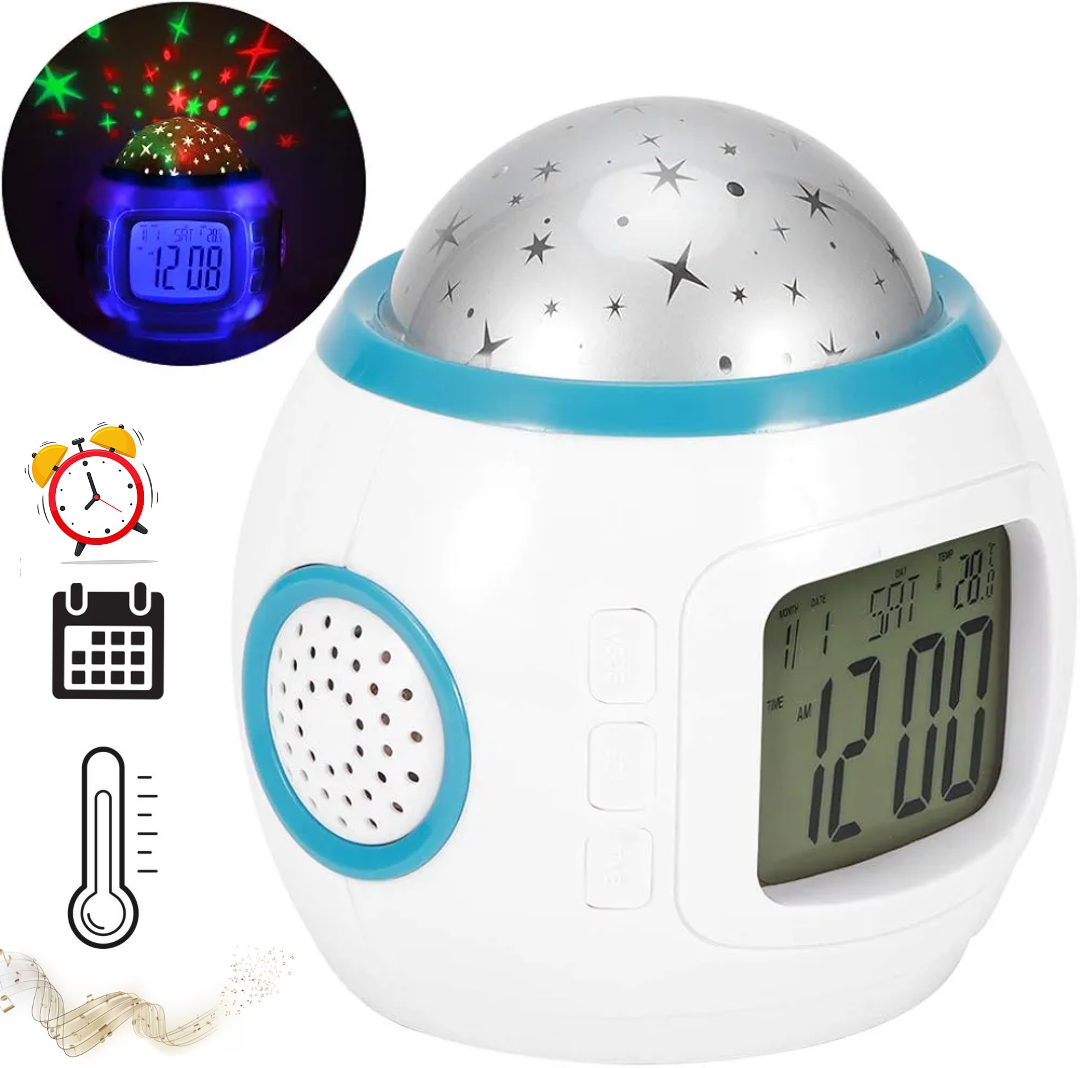 Réveil Projecteur – Écran LCD – Mélodies et Lumières Multi-Étoiles – Affichage du Calendrier – Heure Date Semaine – Température