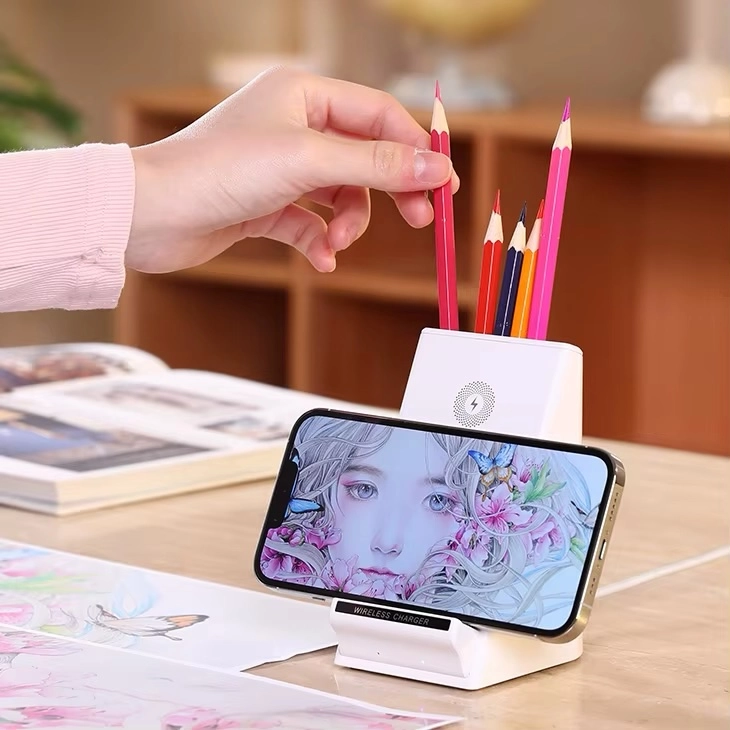 Ce support de bureau multifonction avec chargeur sans fil est conçu pour offrir confort, praticité et organisation au quotidien. Il permet de recharger votre smartphone aussi bien à l’horizontale qu’à la verticale, tout en l’utilisant librement pour travailler, étudier ou regarder du contenu.